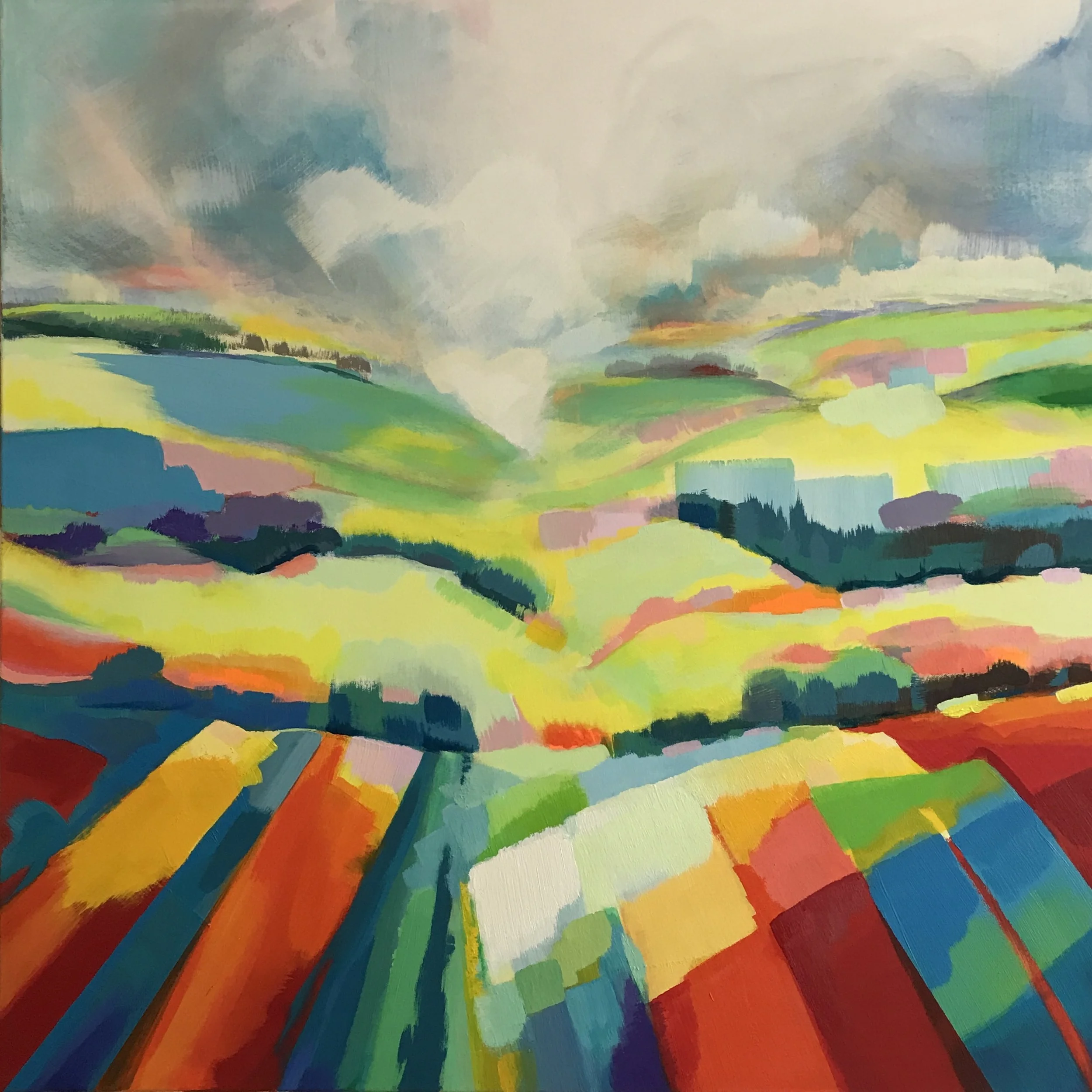 Vanessa Clemente Vincerò, currently residing in Stroud, chooses to emphasise the value of abstract formal elements, such as line, tone and composition to inform her visual language, the expressive use of colour is at the core of her artistic practice. Vanessa finds herself increasingly motivated to represent the local landscape. This she interprets with exuberant large-scale paintings executed in vibrant colours and dynamic compositions. Vanessa favours the use of acrylic paint on canvas for the vivid hues and varied tactile qualities achievable with this medium.